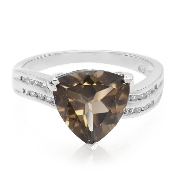 Entdecken Sie die warme Anziehungskraft dieses raffinierten Rauchquarzrings, der von funkelnden weißen Topas-Akzenten elegant ergänzt wird. Der aus Brasilien stammende 2,53 Karat schwere Quarz im Trillantschliff hat einen tiefen, glühenden Farbton und ist in feinem 925er Sterling Silber mit einem Gesamtgewicht von ca. 2,15 Gramm gefasst. Dieser Ring eignet sich perfekt, um Ihrem Ensemble einen Hauch von erdiger Eleganz zu verleihen, und lässt sich mühelos von der Tages- bis zur Abendgarderobe tragen. Die 20 weißen Topas-Edelsteine, die das Band umgeben, unterstreichen die Brillanz und den Charme dieses exquisiten Stücks.