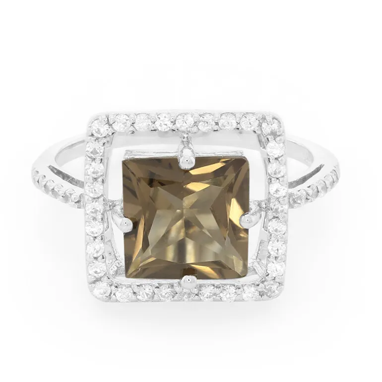 Entdecken Sie die Anziehungskraft dieses atemberaubenden Rings aus Sterlingsilber, gekrönt von einem brasilianischen Rauchquarz mit 3,08 Karat. Mit seinem quadratischen Prinzessschliff und flankiert von 42 funkelnden kambodschanischen Zirkonen von insgesamt 0,605 Karat, glänzt dieser Ring mit Raffinesse. Die silberne Fassung mit einem Gewicht von ca. 2,49 Gramm passt zu den tiefen, erdigen Tönen des Quarzes und macht ihn zu einem fesselnden Schmuckstück. Dieser Ring eignet sich sowohl für die Freizeit als auch für besondere Anlässe und wird Ihr Ensemble mit seinem glühenden Charme aufwerten.