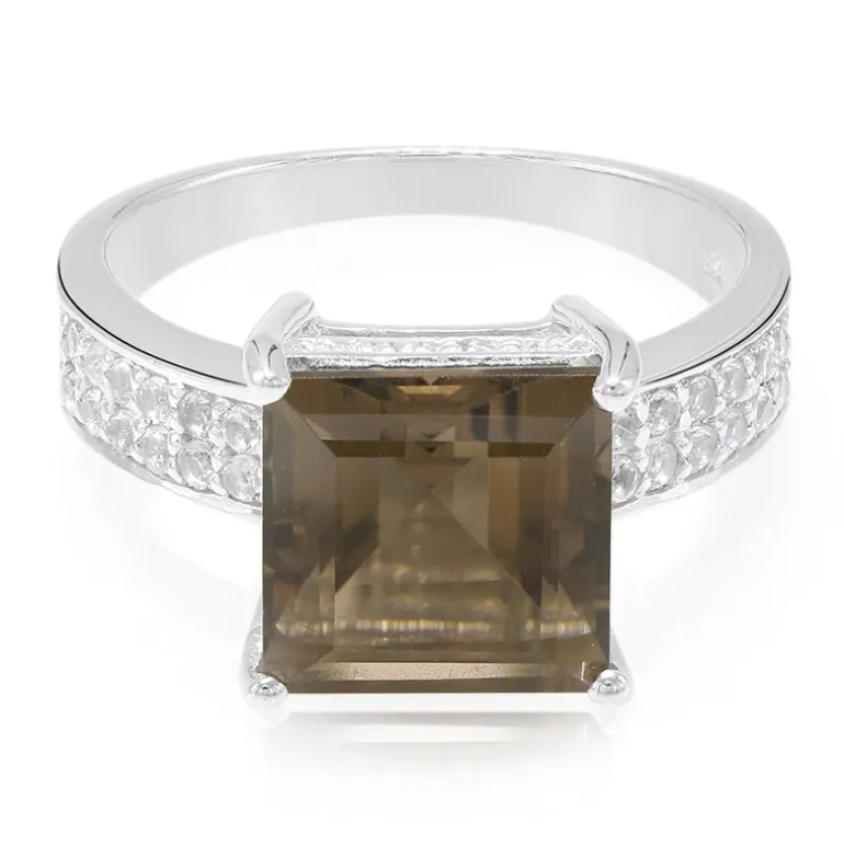 Unser Ring aus brasilianischem Rauchquarz ist eine Sinfonie der Eleganz mit einem raffinierten 2,81 Karat schweren Mittelstein im Quadratschliff. Umgeben von einer Reihe brillanter weißer Topase von insgesamt 0,302 Karat, strahlt dieses Stück aus 925er Sterlingsilber vor Glamour. Der tiefe Farbton des Rauchquarzes (ca. 9 mm) bildet einen schönen Kontrast zu den funkelnden Topasen und dem schlanken Silberband. Dieser Ring ist ideal für Abendveranstaltungen oder als schickes Upgrade für Ihre Bürokleidung und verspricht eine zeitlose Ergänzung für jede Schmucksammlung zu sein.