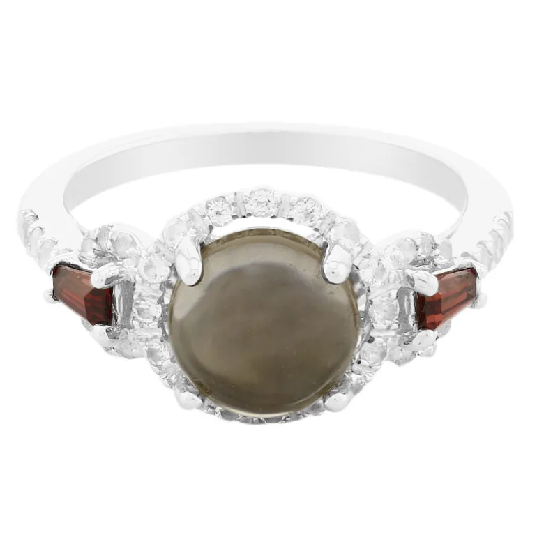 Entdecken Sie die sinnliche Anziehungskraft dieses Rings aus brasilianischem Rauchquarz, der von feurigen Mosambik-Granaten flankiert und von einem Kranz aus funkelnden weißen Topasen umgeben ist. Der aus 925er Sterlingsilber gefertigte Ring ist mit einem runden Quarz-Cabochon von 1,8 Karat in der Mitte und einem Gesamtgewicht von 2,364 Karat besetzt. Mit einer Größe von 27 x 21 mm ist er ein elegantes und vielseitiges Schmuckstück, das sich sowohl für zwanglose Ausflüge als auch für anspruchsvolle Abendveranstaltungen eignet. Kombinieren Sie ihn mit Erdtönen, um seinen rauchigen Farbton zu betonen, oder heben Sie ihn von einem monochromen Ensemble ab.