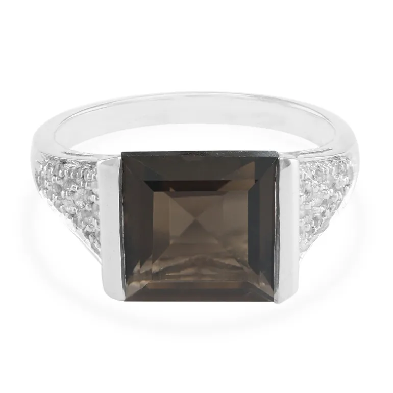 Entdecken Sie die Faszination unseres Rings aus brasilianischem Rauchquarz und weißem Topas, ein Meisterwerk von subtiler Eleganz, das mit Präzision gefertigt wurde. Dieses edle Schmuckstück verfügt über einen hübschen 2,99ct Rauchquarz-Mittelstein mit einem raffinierten quadratischen Schliff, der das Licht in jedem Winkel reflektiert. Flankiert wird der Ring von 44 weißen Topas-Edelsteinen mit einem Gesamtgewicht von 0,264 ct. Der Ring ist in hochwertiges 925er Sterling Silber gefasst und wiegt etwa 2,51 g. Sein Design verspricht Vielseitigkeit und lässt sich mühelos von der Tagesgarderobe bis hin zum glamourösen Abendkleid kombinieren. Dieser Ring ist ein ideales Geschenk oder eine wertvolle Ergänzung zu Ihrer eigenen Sammlung und verleiht jedem Outfit einen Hauch von Klasse.