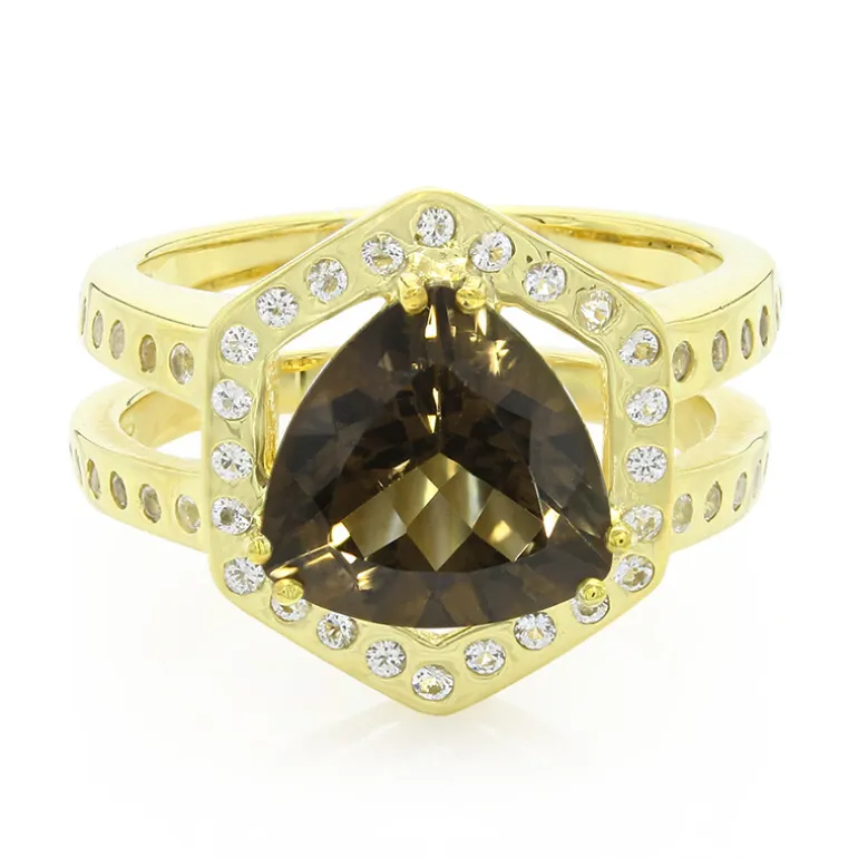 Entdecken Sie die warme Anziehungskraft dieses fesselnden Rauchquarzrings aus glänzend vergoldetem 925er Sterlingsilber. Das aus Brasilien stammende Mittelstück im Trillant-Schliff hat beachtliche 2,42 Karat und wird von einem Halo aus 48 funkelnden weißen Topasen mit insgesamt 0,334 Karat verziert. Das Gesamtgewicht dieses Schmuckstücks beträgt 2,754 Karat. Mit seinen Abmessungen von 26,5 x 21 mm ist er nicht nur ein Ring, sondern ein Statement. Er ist ideal für elegante Abende oder für den anspruchsvollen Alltag und passt hervorragend zu erdfarbener Kleidung oder klassischem Schwarz.