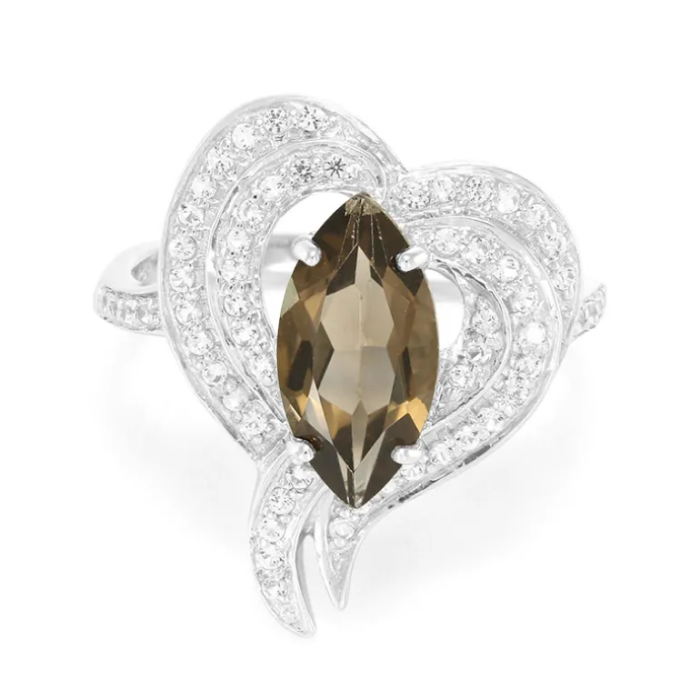 Dieser Ring aus brasilianischem Rauchquarz mit einem prächtigen Edelstein im Marquise-Schliff von 1,36 Karat ist der Star unter den Schmuckstücken. Dieses Schmuckstück aus 925er Sterlingsilber wird von 59 funkelnden weißen Topasen mit einem Gesamtgewicht von 0,311 Karat umrahmt und ist ebenso elegant wie eindrucksvoll. Die anmutigen Wirbel, die den rauchigen Mittelteil einrahmen, vermitteln ein Gefühl von Luxus. Dieser Ring ist ein perfektes Accessoire für Abendveranstaltungen oder um Ihrer Alltagskleidung einen Hauch von Raffinesse zu verleihen.