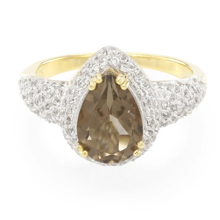 Tauchen Sie ein in die warme, durchscheinende Anziehungskraft dieses Rings aus brasilianischem Rauchquarz, der in 925er Sterlingsilber gefasst ist und von einem Kranz aus 127 funkelnden weißen Topasen akzentuiert wird. Mit einem Gesamtkaratgewicht von 2,117 Karat bringt der Birnenschliff des Hauptedelsteins seine schwelenden Töne noch besser zur Geltung. Dieses raffinierte Schmuckstück mit einem Gewicht von ca. 2,29 g passt sowohl zu Tages- als auch zu Abendgarderobe und verspricht, eine vielseitige Ergänzung Ihrer Sammlung zu sein.