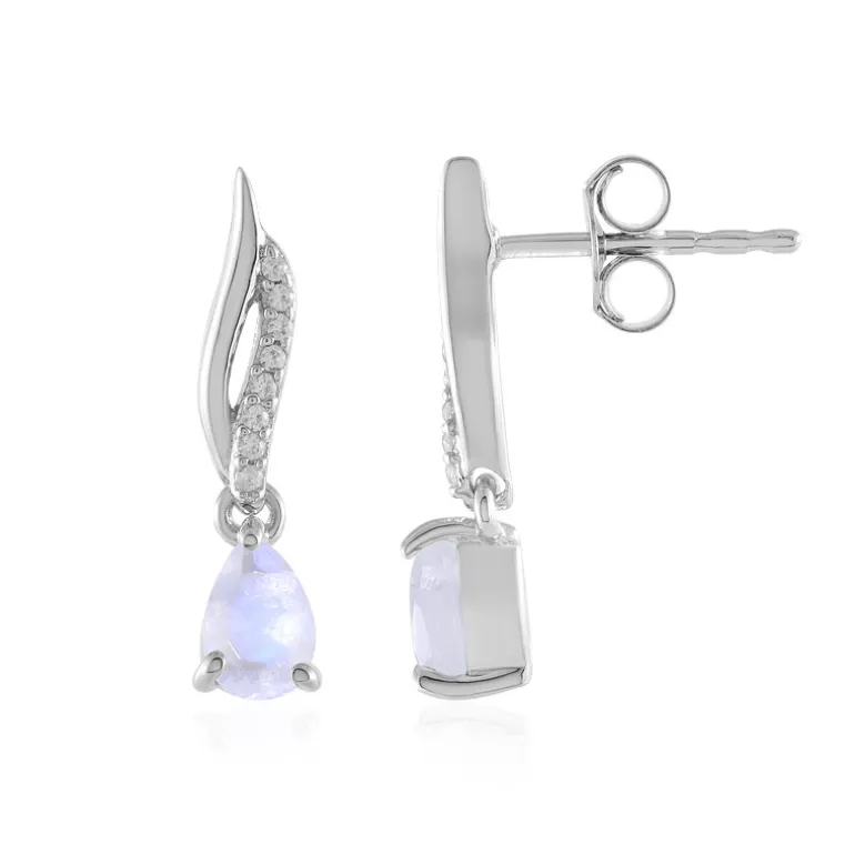 Entdecken Sie die Eleganz dieser fesselnden Ohrringe aus Regenbogenmondstein. Jeder der Ohrringe besteht aus einem 6×4 mm großen, birnenförmigen Stein aus Indien, der von Zirkonen im Rundschliff aus Kambodscha ergänzt wird. Die Ohrringe aus platiniertem 925er Sterlingsilber versprühen einen modernen Charme. Sie sind ideal für Abendveranstaltungen oder ein romantisches Abendessen und lassen sich mit einem eleganten Kleid oder einem legeren Outfit kombinieren, um zu glänzen.