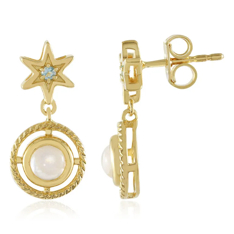 Diese strahlenden Ohrringe sind mit runden Cabochons aus srilankischen Regenbogen-Mondsteinen besetzt, die durch brasilianische Blautopase aus der Schweiz wunderbar ergänzt werden. Gefertigt aus 925er Sterlingsilber mit einer zarten Goldplattierung, strahlen sie Charme und Eleganz aus. Sie sind perfekt, um jedem Outfit einen Hauch von himmlischem Glanz zu verleihen, und lassen sich nahtlos vom Tagesschick zum Abendglamour verwandeln. Ideal für legere und formelle Anlässe.