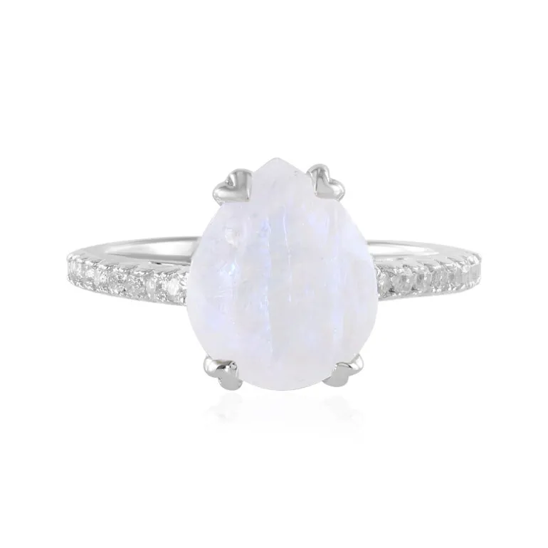 Entdecken Sie die bezaubernde Anziehungskraft dieses exquisiten Rings mit einem Regenbogenmondstein aus Sri Lanka. Der dominante birnenförmige Edelstein wiegt beeindruckende 2,517 Karat und wird durch einen Heiligenschein aus funkelnden kambodschanischen Zirkonen von insgesamt 0,337 Karat hervorragend ergänzt. Gefertigt aus platiniertem 925er Sterling Silber, verspricht dieser Ring Langlebigkeit und Glanz. Seine Vielseitigkeit ist unübertroffen – perfekt, um sowohl dem Alltag als auch besonderen Anlässen einen Hauch von Eleganz zu verleihen.