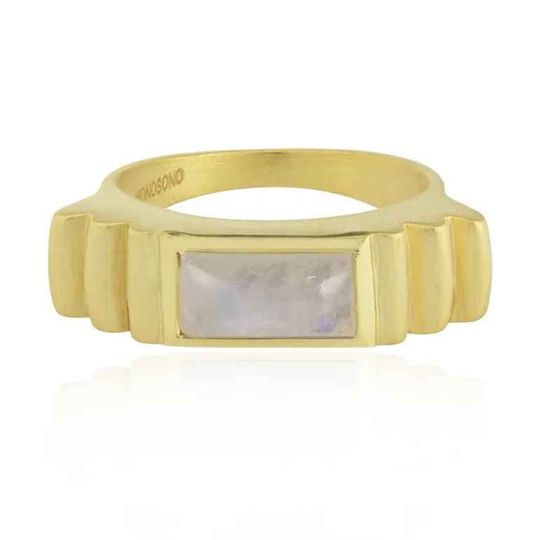 Entdecken Sie die faszinierende Schönheit dieses indischen Regenbogenmondsteins. Eingefasst in einen luxuriösen Ring aus vergoldetem 925er Sterling Silber, versprüht dieser 2,025ct Baguette-Cabochon Edelstein aus Indien einen mystischen Charme. Das elegante Design aus der exklusiven MONOSONO COLLECTION bietet eine moderne Interpretation klassischer Eleganz und macht ihn zu einer vielseitigen Ergänzung für jedes Ensemble. Dieser Ring ist sowohl für den eleganten Tag als auch für den glamourösen Abend geeignet. Er zieht die Blicke auf sich und wird zu einem beliebten Schmuckstück in Ihrer Sammlung.
