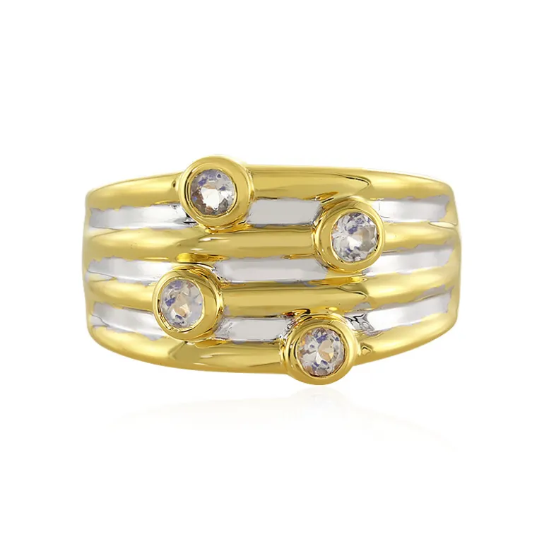 Entdecken Sie die magische Anziehungskraft dieses Rings aus vergoldetem 925er Sterlingsilber mit vier Regenbogen-Mondsteinen im Rundschliff von insgesamt 0,387 Karat aus Indien. Das mehrreihige Design und die schimmernde Verzierung des Rings sorgen für einen modernen und doch zeitlosen Stil, der jedem Ensemble einen Hauch von Schillern verleiht. Ob für einen legeren Brunch oder eine abendliche Gala, dieses bezaubernde Stück verspricht eine auffällige Ergänzung Ihrer Schmucksammlung zu sein.