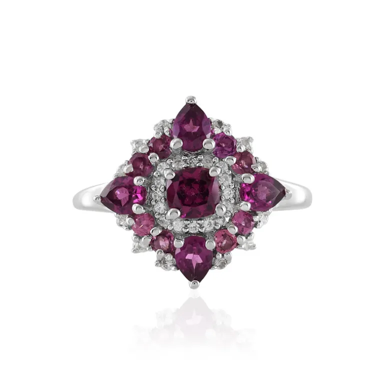 Tauchen Sie ein in den zeitlosen Charme unseres Vintage Cushion & Teardrop Rhodolite Silberrings. Dieses exquisite Stück präsentiert einen zentralen antiken brasilianischen Rhodolithen im Kissenschliff, der von einem eleganten Ensemble aus Edelsteinen im Tropfen- und Rundschliff umrahmt wird und einen harmonischen Ausbruch leuchtender Magentatöne erzeugt. Die kambodschanischen Zirkon-Akzente verleihen dem Band aus 925er Sterlingsilber einen besonderen Glanz. Genießen Sie das Gesamtgewicht der Edelsteine von 1,69 ct und das sorgfältig gearbeitete Design von 22 x 20 mm. Dieser Ring strahlt Raffinesse aus und ist eine wunderbare Wahl sowohl für zwanglose Brunchs als auch für aufwändige Abendveranstaltungen.