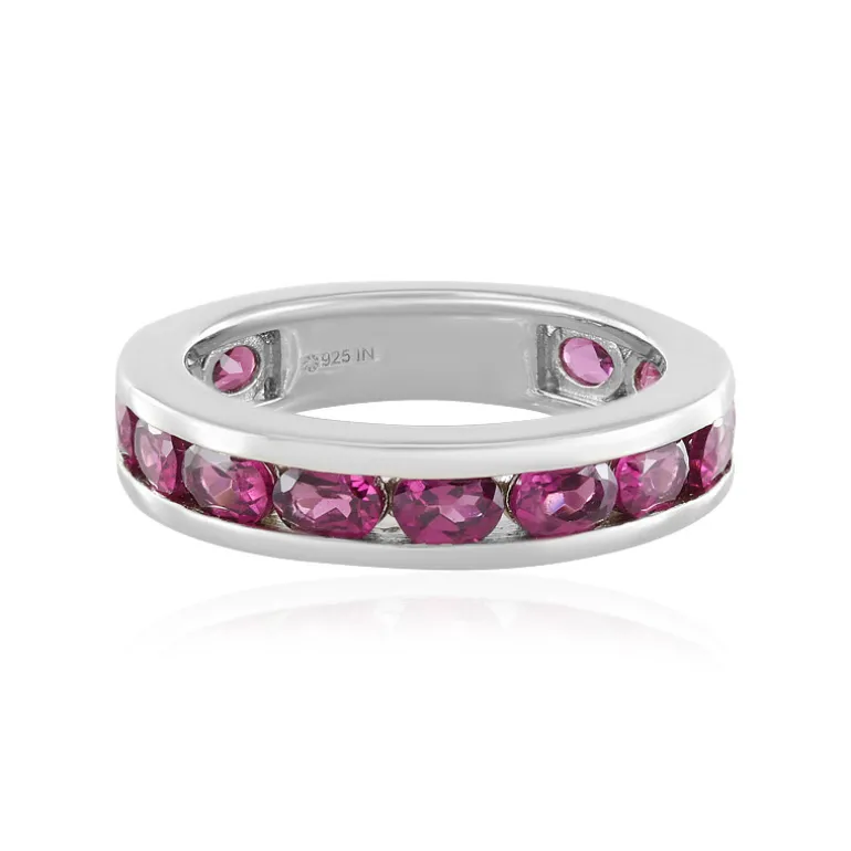 Dieser strahlende Ring präsentiert eine Reihe von 13 indischen Rhodolithen im Ovalschliff mit insgesamt 2,844 Karat, die elegant in platiniertes 925er Sterlingsilber gefasst sind. Der helle, beerenähnliche Farbton der Edelsteine bildet einen auffälligen Kontrast zu dem schlanken Silberband und schafft so ein modernes und doch zeitloses Schmuckstück. Er ist ein vielseitiges Accessoire, das sich sowohl für besondere Anlässe als auch für den Alltag eignet und jedem Ensemble einen Farbakzent verleiht. Kombinieren Sie ihn mit den passenden Rhodolith-Ohrringen oder tragen Sie ihn einzeln für einen auffälligen Blickfang.