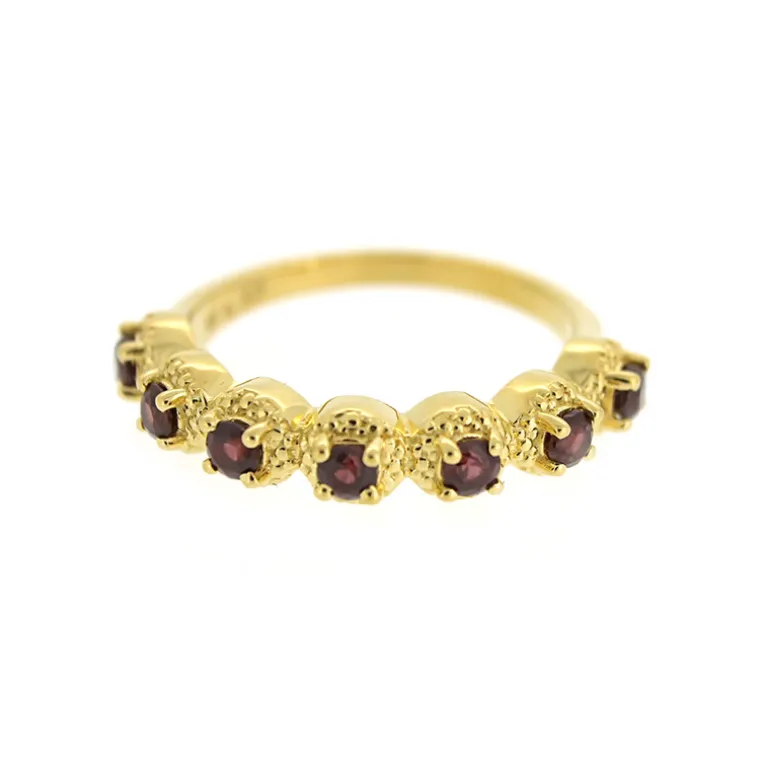 Schmücken Sie Ihre Hand mit diesem faszinierenden indischen Rhodolith-Ring, der ein Gesamtgewicht von 0,979 Karat aufweist. Die sieben Rhodolithen im Rundschliff strahlen in einem satten, himbeerfarbenen Farbton, der wunderbar mit dem warmen Glanz des 925er Sterlingsilberbandes kontrastiert, das für einen zusätzlichen Hauch von Glamour aufwändig vergoldet wurde. Dieses Accessoire mit einem Gewicht von ca. 4,04 Gramm strahlt mit seinem subtilen Funkeln Eleganz aus und ist vielseitig genug, um Ihr Alltagsoutfit zu verschönern oder Ihre Abendgarderobe aufzuwerten. Ein zeitloses Stück, das jede Schmucksammlung bereichern wird.