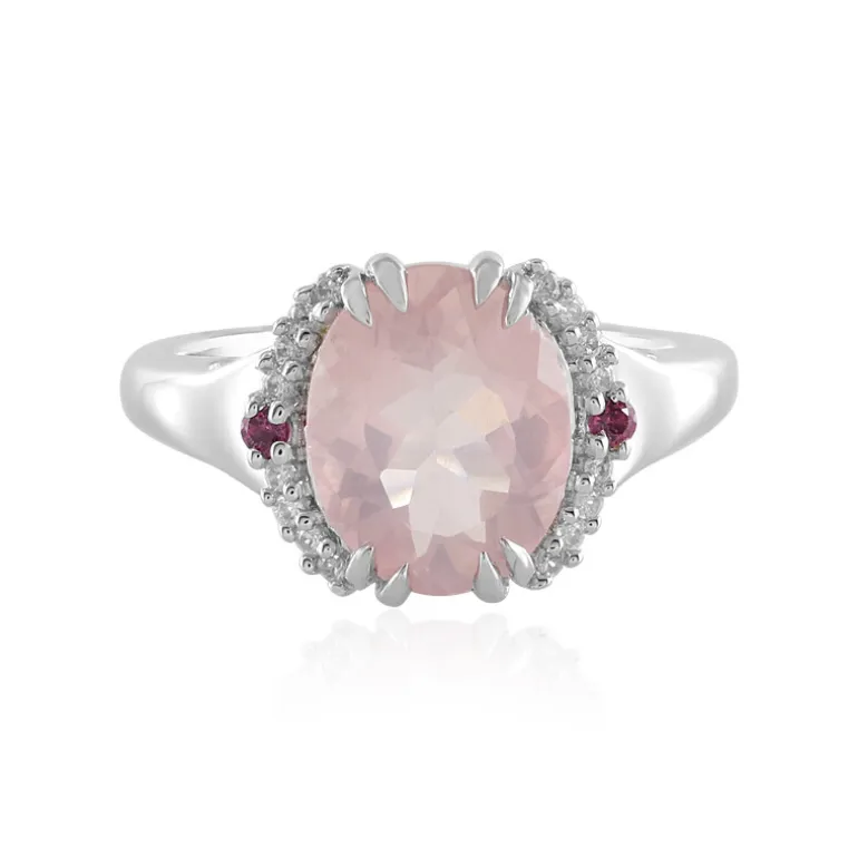 Entdecken Sie den Charme dieses Rings aus brasilianischem Rosenquarz, akzentuiert mit strahlenden Rhodolithen und funkelnden Zirkonen aus Kambodscha, gefasst in poliertem 925er Sterling Silber. Der Rosenquarz im Ovalschliff mit einem Gewicht von 2,034 Karat ist das Herzstück dieses Schmuckstücks, flankiert von glitzernden Edelsteinen mit insgesamt 2,187 Karat. Mit einer Größe von 23×19 mm verleiht dieser Ring jedem Outfit einen Hauch von Raffinesse und eignet sich sowohl für einen legeren Brunch als auch für elegante Abende. Der zartrosa Farbton und die zeitlose Silberfassung machen ihn zu einem idealen Geschenk oder zu einer bezaubernden Ergänzung Ihrer Schmucksammlung.