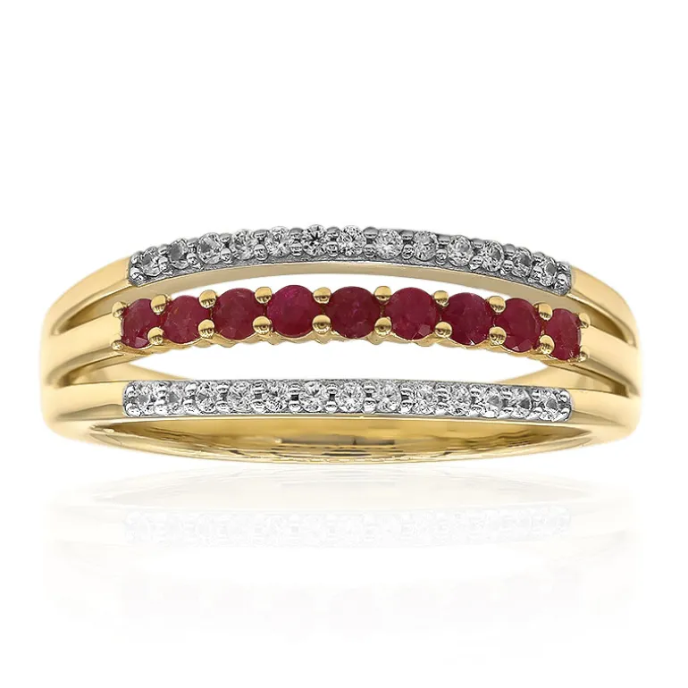 Dieser exquisite Ring besteht aus einem Band aus 9-karätigem Gelbgold, das mit neun roten Berylls im Rundschliff von insgesamt 0,199 Karat aus den USA besetzt ist, flankiert von funkelnden Zirkonen aus Tansania von 0,159 Karat. Das Gesamtkaratgewicht des Rings beträgt 0,358 Karat und macht ihn nicht nur zu einem atemberaubenden Schmuckstück, sondern auch zu einer wertvollen Ergänzung für jede Sammlung. Sein modernes und doch zeitloses Design macht ihn zu einem vielseitigen Begleiter für legere und formelle Anlässe und damit zu einem hinreißenden Schmuckstück für jede Gelegenheit.