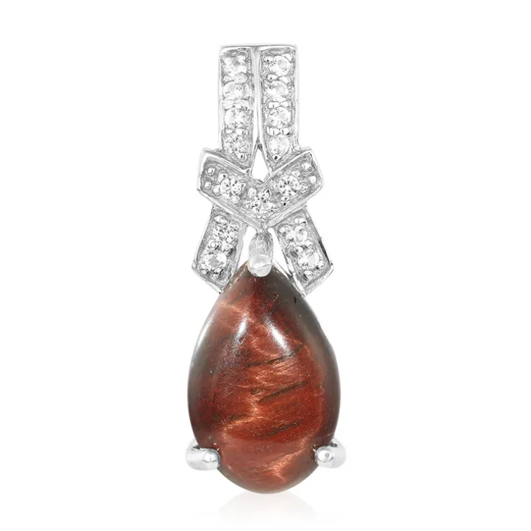 Entdecken Sie die Faszination dieses auffälligen roten Tigeraugen-Anhängers mit einem 4,47-karätigen Tropfen-Cabochon aus Mexiko. Ergänzt durch 15 funkelnde weiße Topas-Steine aus Brasilien strahlt dieses Schmuckstück Eleganz aus. Er ist aus 925er Sterlingsilber gefertigt und eignet sich sowohl für die Freizeit als auch für formelle Anlässe. Kombinieren Sie es mit Ihrem Lieblingsoutfit für einen Hauch von anspruchsvollem Charme.