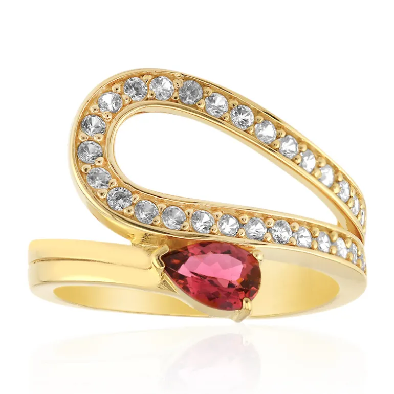 In der Mitte dieses atemberaubenden Rings befindet sich ein lebendiger Rubellit aus Madagaskar mit einem Gewicht von 0,352 Karat und einem exquisiten Tropfenschliff. Eingerahmt von funkelnden Zirkonen aus Kambodscha mit einem Gesamtgewicht von 0,57 Karat, die vor dem Hintergrund von 925er Sterlingsilber mit einer luxuriösen Goldplattierung mit einem Gewicht von etwa 3,3 Gramm gefasst sind. Die Kombination aus dem warmen Goldton und dem satten Rubellit-Farbton macht diesen Ring zu einem vielseitigen Schmuckstück, das sich sowohl für legere als auch für formelle Anlässe eignet. Ein Gesamtgewicht von 0,922 Karat macht diesen Ring zu einem herausragenden Accessoire für jeden Edelsteinliebhaber und jede Sammlung.