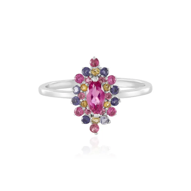 Schmücken Sie Ihren Finger mit einem Hauch von Farbe und Raffinesse. Dieser exquisite Ring aus Sterlingsilber trägt als Herzstück einen atemberaubenden Madagaskar-Rubellit im Marquiseschliff mit einem Gewicht von 0,214 Karat. Er ist umgeben von einem verspielten Arrangement aus Rubelliten, Iolithen und Citrinen im Rundschliff, die zusammen ein Gesamtgewicht von 0,507 ct ergeben. Die lebhafte Mischung aus rosa, violetten und gelben Farbtönen auf einem glänzenden, platinierten Silberband macht diesen Ring zu einem vielseitigen Schmuckstück, das sich sowohl für die Freizeit als auch für formelle Anlässe eignet. Er ist ein Schatz, der die Sammlung eines jeden Schmuckliebhabers bereichern wird.