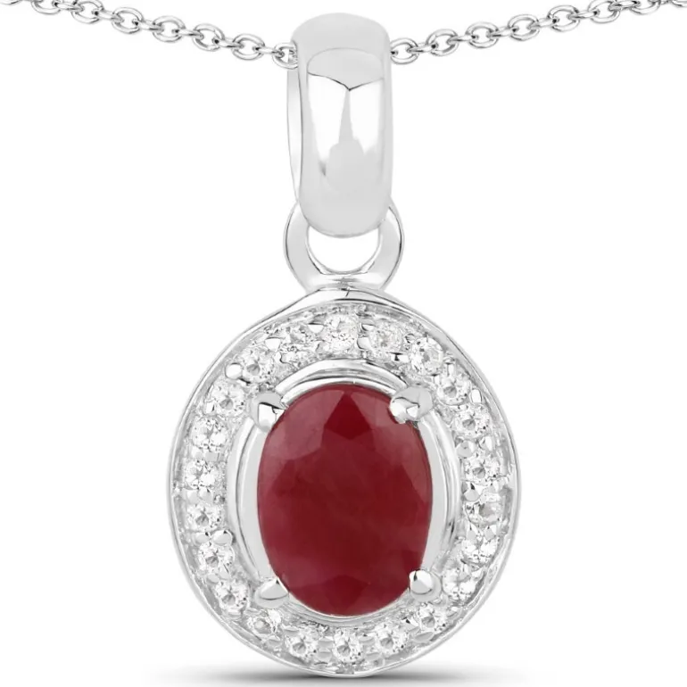 Entdecken Sie die Anziehungskraft unserer thailändischen Rubin-Halskette im Ovalschliff, umgeben von funkelnden indischen Weißtopasen. Dieses Schmuckstück mit 0,765 ct Rubin und 0,162 ct leuchtenden Topasen ist aus feinem 925er Sterling Silber mit einem Gewicht von ca. 3 g gefertigt. Der Anhänger mit den Maßen 19,3 x 10,4 mm hängt elegant an einer 45 cm langen Kette und ist eine vielseitige Ergänzung für jede Schmucksammlung. Sein klassisches Design verleiht sowohl Tages- als auch Abendgarderobe einen Hauch von Raffinesse und ist perfekt für alle, die die zeitlose Eleganz von Edelsteinen zu schätzen wissen.
