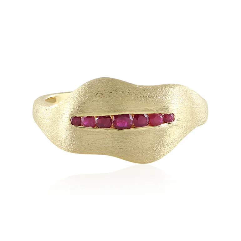 Entdecken Sie einen Hauch von exotischer Eleganz mit diesem wunderschön gearbeiteten Ring, der sorgfältig ausgewählte thailändische Rubine mit einem Gesamtgewicht von 0,154 Karat enthält. Jeder Stein ist präzise geschliffen, um seinen strahlenden Farbton zu maximieren, und anmutig in 925er Sterlingsilber mit einer trendigen Goldplattierung gefasst, die einen Hauch von Raffinesse verleiht. Die einzigartige, strukturierte Oberfläche und die leuchtende Farbe machen diesen Ring zu einem idealen Accessoire für Freizeitkleidung und besondere Anlässe.