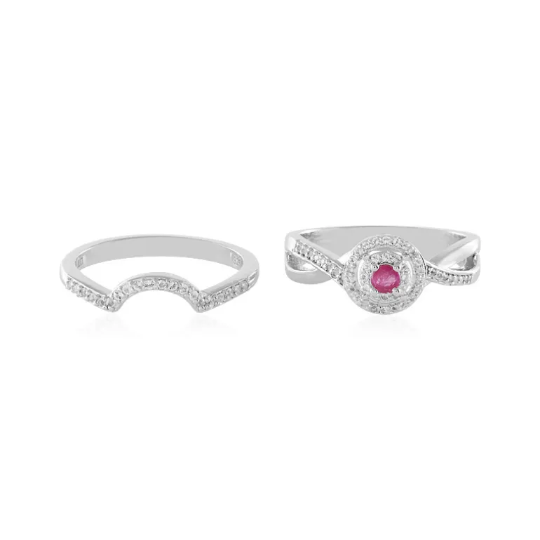 Dieser bezaubernde Ring zeigt einen lebhaften thailändischen Rubin im Rundschliff in der Mitte, umgeben von einem Heiligenschein aus glitzernden weißen Topasen aus Indien, eingebettet in ein schickes 925er Sterlingsilberband. Das doppelte Design wirkt wie zwei ineinander greifende Teile, was seine moderne Eleganz unterstreicht. Mit einem Edelsteingewicht von insgesamt 0,405 Karat ist dieser Ring ebenso substanziell wie stilvoll. Er eignet sich perfekt, um Ihrem alltäglichen Ensemble einen Farbakzent zu verleihen oder einen raffinierten Look für einen Abend zu ergänzen.