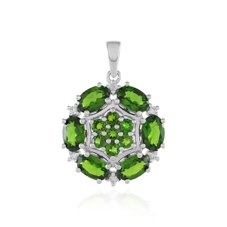 Erfreuen Sie sich an diesem atemberaubenden russischen Diopsid-Anhänger, der elegant aus platiniertem 925er Sterlingsilber gefertigt ist. Mit sechs ovalen und sieben runden Diopsiden aus Russland, ergänzt durch funkelnde Zirkon-Akzente aus Kambodscha, ist dieses 25×19 mm große Stück ein Meisterwerk. Perfekt für die Abendgarderobe oder besondere Anlässe: Kombinieren Sie ihn mit einem eleganten schwarzen Kleid, um seine lebhaften grünen Farbtöne erstrahlen zu lassen.
