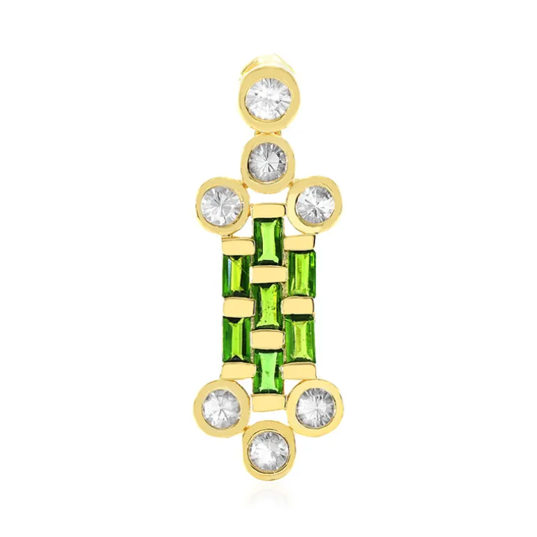 Entdecken Sie den lebendigen Reiz dieses Anhängers aus vergoldetem 925er Sterlingsilber mit 7 russischen Diopsid-Edelsteinen im Oktagon-Schliff, die zusammen 0,778 ct ergeben. Akzentuiert durch funkelnde kambodschanische Zirkone von insgesamt 1,021 ct, strahlt dieser Anhänger einen festlichen Glanz aus. Mit einer Größe von 33 x 12 mm ist er perfekt geeignet, um Ihre Abendgarderobe aufzuwerten oder ein legeres Outfit zu verschönern, ohne Ihren Stil zu überfordern. Dieses Schmuckstück vereint die Mystik russischer Edelsteine mit dem Glanz von Zirkonen und ist eine wahre Freude für Edelsteinliebhaber.
