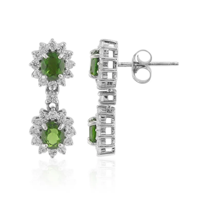 Wir stellen unsere atemberaubenden Ohrringe mit russischen Diopsid-Edelsteinen vor, die elegant in 925er Sterlingsilber mit Platin-Finish gefasst sind. Der leuchtend grüne Diopsid gepaart mit funkelnden kambodschanischen Zirkonen verleiht einen Hauch von Raffinesse, perfekt für besondere Anlässe oder einen Abend. Diese Ohrringe sind ein vielseitiges Accessoire, das sowohl legere als auch formelle Outfits mit seinem anmutigen Charme aufwertet.