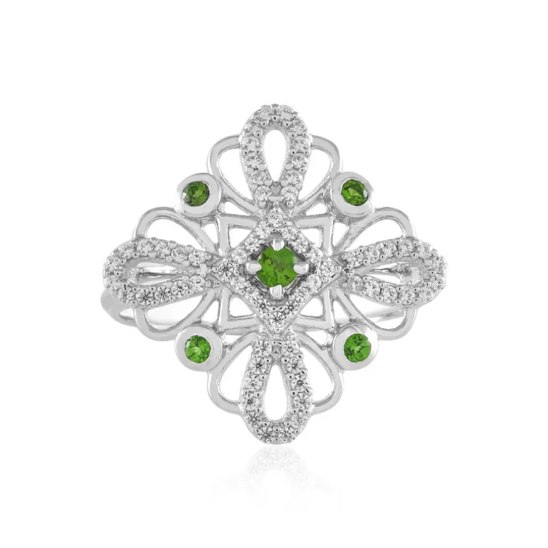 Entdecken Sie die Faszination dieses atemberaubenden Silberrings mit leuchtenden russischen Diopsiden und funkelnden Zirkonen aus Kambodscha. Das komplizierte Design hebt die grünen Edelsteine hervor und macht ihn zu einem Highlight für jede Gelegenheit. Dieser Ring eignet sich perfekt für die Abendgarderobe oder als eleganter Begleiter zu Freizeitoutfits und verbindet zeitlosen Luxus mit modernem Stil. Ein Muss für Schmuckliebhaber.