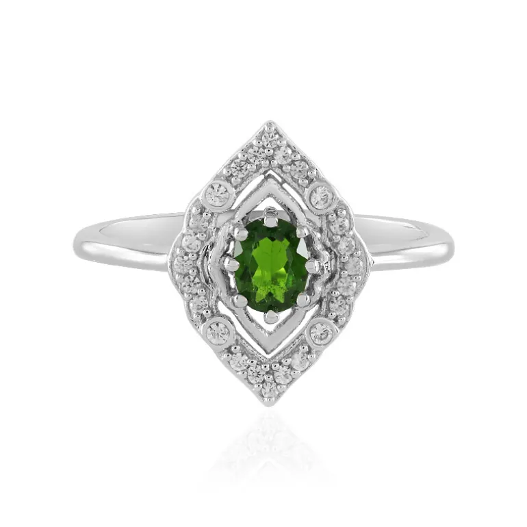 Erleben Sie Eleganz mit diesem atemberaubenden Ring aus russischem Diopsid, dessen Herzstück ein Edelstein im Ovalschliff von 0,297 Karat ist. Der leuchtend grüne Stein wird durch kambodschanische Zirkone in platiniertem Sterlingsilber wunderbar ergänzt. Das raffinierte Design dieses Rings ist ideal für den Abend und verleiht jedem Outfit Raffinesse. Er eignet sich perfekt für besondere Anlässe oder als unverwechselbares Alltagsstück.