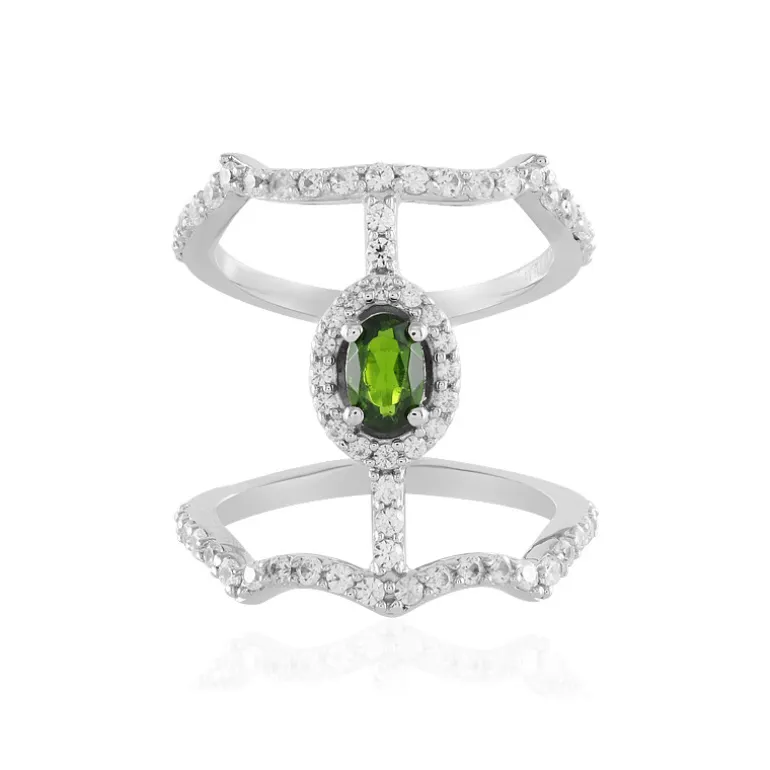 Tauchen Sie ein in die Eleganz dieses atemberaubenden Silberrings mit russischem Diopsid und einem exquisiten Diopsid im Ovalschliff von 0,441 Karat als Herzstück. Umgeben von schimmernden Zirkonen mit einem Gesamtgewicht von 0,958 ct und ergänzt durch weitere Zirkone mit einem Gewicht von 0,19 ct, präsentiert sich diese Schönheit aus 925er Sterlingsilber mit einem Gesamtgewicht von 1,589 ct. Das Cross-Over-Design verleiht dem Ring eine moderne Note und macht ihn zu einem echten Blickfang für jedes Ensemble. Der Ring ist plattiert und verleiht Ihrem Outfit einen leuchtenden grünen Farbton. Ein kühnes Statement für besondere Anlässe oder eine raffinierte Note für das tägliche Tragen.