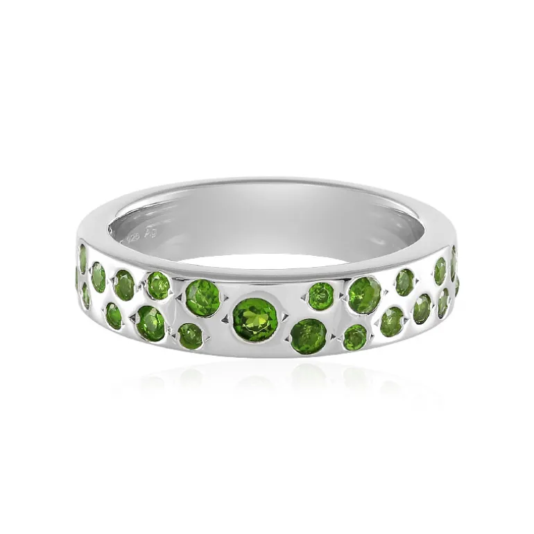 Dieser atemberaubende Ring zeigt eine Konstellation russischer Diopside, die in hochwertiges platiniertes 925er Sterlingsilber gefasst sind. Jeder Edelstein im Rundschliff funkelt in einem tiefen Grünton und wiegt zusammen 0,583 Karat. Dieses moderne Schmuckstück mit einem Hauch von Eleganz ist perfekt geeignet, um sowohl der Alltags- als auch der Abendgarderobe einen Farbtupfer zu verleihen. Sein vielseitiges Design sorgt dafür, dass er eine Reihe von Outfits von casual bis couture ergänzen kann.