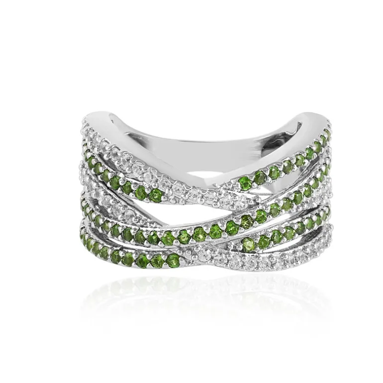 Dieser auffällige Ring besteht aus einem Reigen von 76 russischen Diopsid-Edelsteinen und 48 funkelnden Zirkonen aus Kambodscha mit einem Gesamtkaratgewicht von 1,352 ct. Jeder Stein ist meisterhaft geschliffen, um das Licht einzufangen, gefasst in 925er Sterlingsilber mit einem Platin-Finish für dauerhaften Glanz. Das einzigartige Design dieses Rings ist ideal, um der Tages- und Abendgarderobe einen Hauch von lebendigem Grün zu verleihen und strahlt Raffinesse aus.