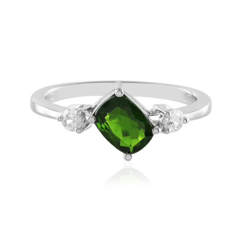 Entdecken Sie die Anziehungskraft dieses faszinierenden Rings mit einem atemberaubenden russischen Diopsid-Edelstein von 1,144 Karat im Antikschliff, der anmutig von platiniertem 925er Sterlingsilber umschlossen wird. Zwei funkelnde kambodschanische Zirkone mit einem Gesamtgewicht von 0,267 ct. flankieren den lebhaften Mittelstein und verleihen dem Schmuckstück einen zusätzlichen Glanz. Das Design des Rings ist modern und doch zeitlos, perfekt für legere Eleganz und formelle Anlässe. Kombinieren Sie dieses wunderbare Schmuckstück mit einem eleganten Abendkleid oder einem professionellen Ensemble, um Ihren Stil zu unterstreichen.