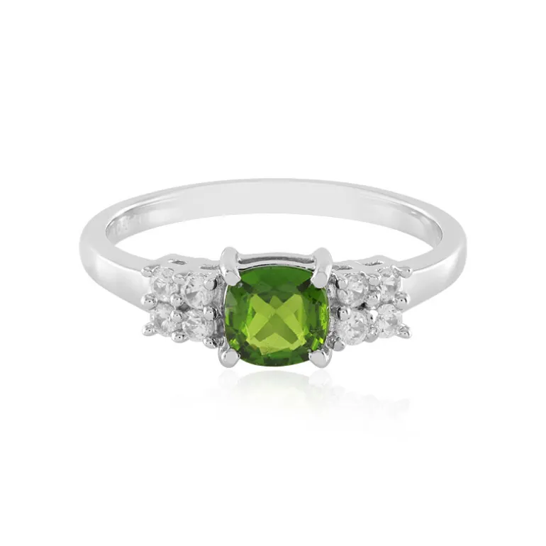 Entdecken Sie die Anziehungskraft dieses auffälligen Rings aus russischem Diopsid, der einen leuchtend grünen Edelstein mit einem antiken Kissenschliff von 0,809 ct präsentiert. Acht funkelnde kambodschanische Zirkone mit einem Gesamtgewicht von 0,405 Karat akzentuieren dieses elegante Schmuckstück aus platiniertem 925er Sterlingsilber mit einem Gesamtgewicht von 1,214 Karat. Er eignet sich perfekt, um jedem Ensemble einen Hauch von Raffinesse zu verleihen und ist eine bezaubernde Wahl für Liebhaber von einzigartigem und hochwertigem Schmuck.
