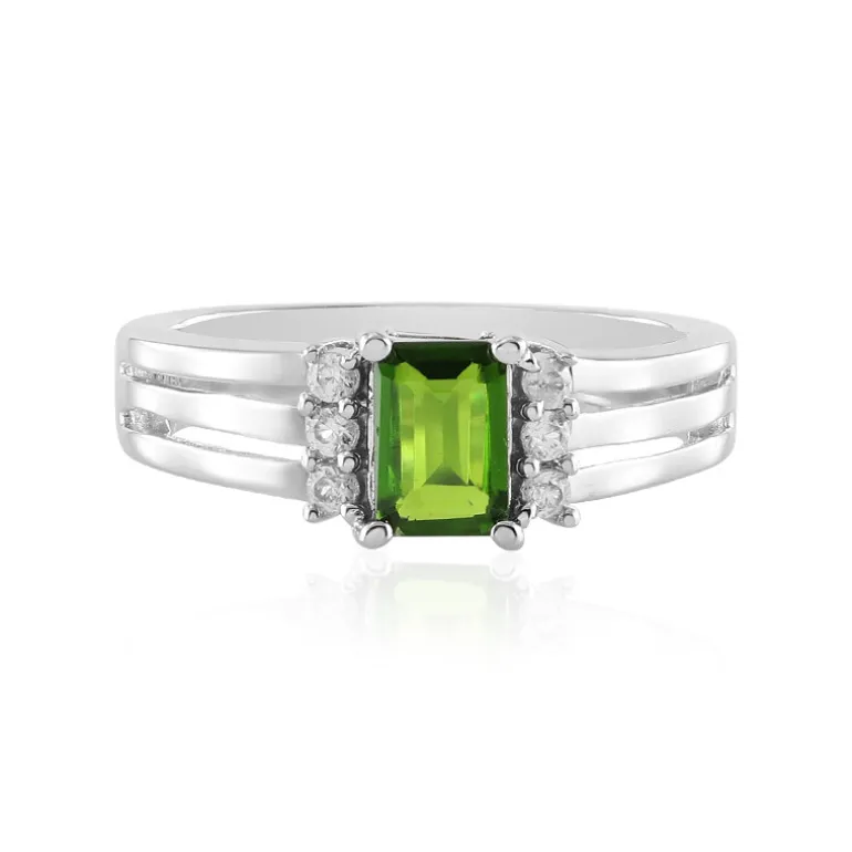 Dieser elegante Ring zeigt in der Mitte einen leuchtenden russischen Diopsid im Achteckschliff, der von schimmernden kambodschanischen Zirkonen flankiert wird. Er ist aus poliertem, platiniertem 925er Sterlingsilber gefertigt und hat ein Gesamtkaratgewicht von 0,641 ct. Dieser Ring ist ein vielseitiges Must-have für jede Schmucksammlung und eignet sich perfekt, um sowohl der Freizeit- als auch der Alltagskleidung einen Hauch von Eleganz zu verleihen.