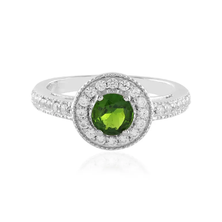 Entdecken Sie die Eleganz dieses exquisiten Rings aus russischem Diopsid mit einem fesselnden 0,687 ct runden Edelstein im Brillantschliff. Das platinierte Stück aus 925er Sterlingsilber wiegt 2,87 g und wird von 30 kambodschanischen Zirkonen akzentuiert. Es ist ideal, um Ihrer Abendgarderobe Raffinesse zu verleihen oder bei besonderen Anlässen ein Statement zu setzen. Eine perfekte Mischung aus Luxus und Stil.