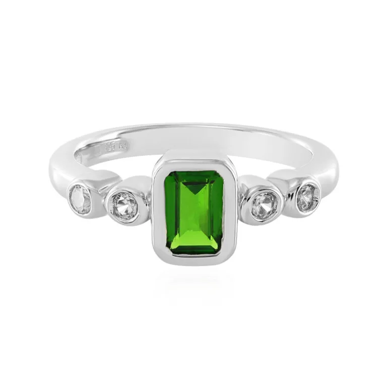 Entdecken Sie die lebendige Anziehungskraft dieses Rings aus 925er Sterlingsilber, der einen atemberaubenden russischen Diopsid-Edelstein von 0,573 Karat im eleganten Achteckschliff präsentiert. Akzentuiert durch vier funkelnde Zirkon Edelsteine von insgesamt 0,206 Karat aus Kambodscha und gefasst in glänzendem, platiniertem Silber, strahlt dieses Stück Raffinesse aus. Der ausgeprägte grüne Farbton des Mittelsteins ist fesselnd und macht ihn zu einer auffälligen Ergänzung Ihrer Schmucksammlung. Dieser Ring eignet sich perfekt, um Ihrer Bürokleidung einen Hauch von Klasse zu verleihen oder um bei Abendveranstaltungen für Gesprächsstoff zu sorgen.