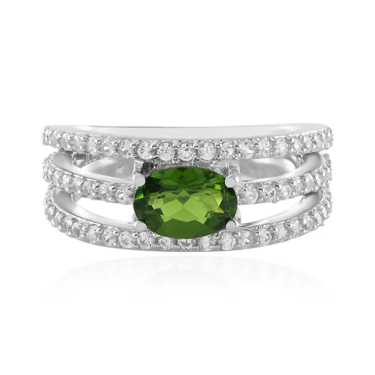 Entdecken Sie die lebendige Anziehungskraft dieses atemberaubenden Rings mit einem russischen Diopsid im Ovalschliff von 0,645 ct. in 925er Sterlingsilber mit einer hochglänzenden Platinbeschichtung. Der leuchtend grüne Farbton wird durch 0,931 Karat funkelnde kambodschanische Zirkone perfekt ergänzt und verleiht Ihrer Hand einen Hauch von Glamour. Dieser Ring ist ideal, um ein lässiges Ensemble aufzuwerten oder einer Abendgarderobe den letzten Schliff zu geben. Er ist eine vielseitige Ergänzung für jede Schmucksammlung.