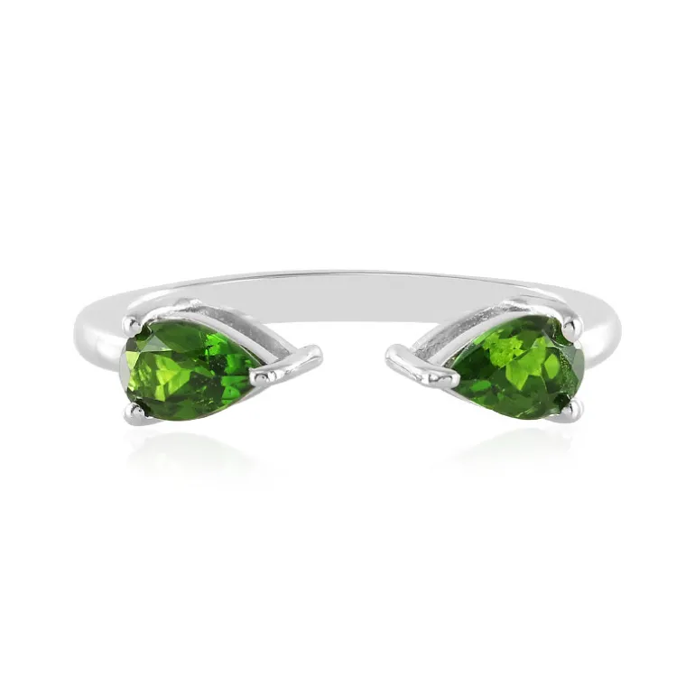 Entdecken Sie den bezaubernden Charme dieses wunderschön gearbeiteten Rings mit zwei leuchtenden russischen Diopside, gefasst in hochwertigem 925er Sterlingsilber mit luxuriösem Platin-Finish. Jeder Edelstein wurde sorgfältig in eine elegante Tropfenform geschliffen und hat ein Gesamtgewicht von 0,729 Karat, das das Licht einfängt und einen üppigen grünen Farbton offenbart. Dieses Schmuckstück ist perfekt für alle, die die feinen Dinge des Lebens zu schätzen wissen und ihrer Kleidung einen Hauch von Raffinesse verleihen möchten. Ob für eine Verlobung am Tag oder eine Abendveranstaltung, dieser Ring ist vielseitig und elegant.