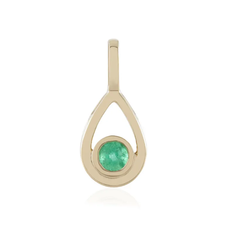 Dieser exquisite Anhänger mit russischem Smaragd ist aus elegantem 9-karätigem Gold gefertigt und mit einem brillanten Smaragd im Rundschliff von 0,385 Karat besetzt. Sein einzigartiges tropfenförmiges Design verleiht ihm einen Hauch von Raffinesse und macht ihn zu einem vielseitigen Accessoire sowohl für legere als auch für formelle Anlässe. Kombinieren Sie ihn mit einer einfachen Kette für einen raffinierten Look, perfekt für Abendveranstaltungen oder ein schickes Tagesensemble.