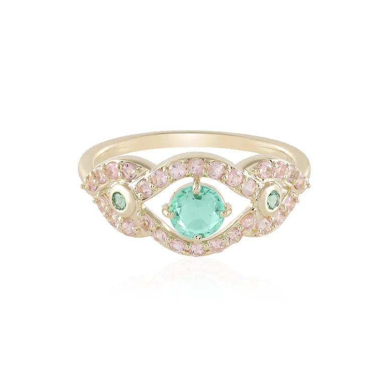 Entdecken Sie die Faszination russischer Smaragde mit diesem atemberaubenden Ring aus 9-karätigem Gold, der die Essenz der Eleganz verkörpert. Im Mittelpunkt steht ein runder Smaragd von 0,406 Karat, flankiert von zwei kleineren Smaragden und umgeben von zarten rosa Turmalinen aus Nigeria von 0,368 Karat, die zusammen ein Karatgewicht von 0,819 Karat ergeben. Das verschlungene Design misst 21×19 mm und verspricht eine auffällige Ergänzung Ihrer Sammlung zu werden. Dieser Ring ist ideal für besondere Anlässe oder als raffinierter Akzent für den Alltag und vermittelt ein Gefühl von klassischer Romantik und zeitloser Schönheit.