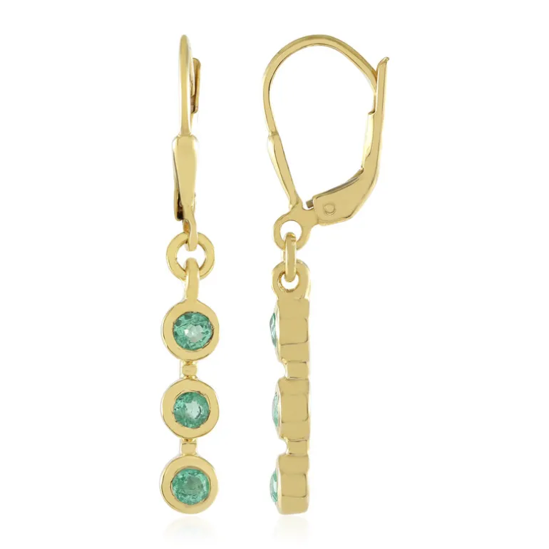 Erleben Sie Eleganz mit diesen raffinierten Ohrringen mit sechs russischen Smaragden im Rundschliff von insgesamt 0,53 Karat. Die 36 mm langen Ohrringe aus 925er Sterlingsilber sind vergoldet und strecken Ihr Dekolleté elegant in die Länge. Perfekt für ein schickes Abendensemble oder einen raffinierten Tageslook, verleihen diese Ohrringe jedem Anlass einen funkelnden Hauch von Luxus.