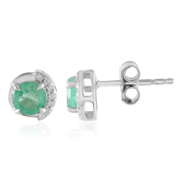 Diese atemberaubenden Ohrringe bestehen aus russischen Smaragden im Rundschliff und funkelnden Zirkonen aus Kambodscha, gefasst in platiniertem 925er Sterlingsilber. Mit einem Gesamtkaratgewicht von 0,777 bringen sie Eleganz in jedes Outfit. Diese Ohrringe sind sowohl für den Tag als auch für den Abend geeignet und verleihen sowohl legeren als auch formellen Looks einen Hauch von Raffinesse.