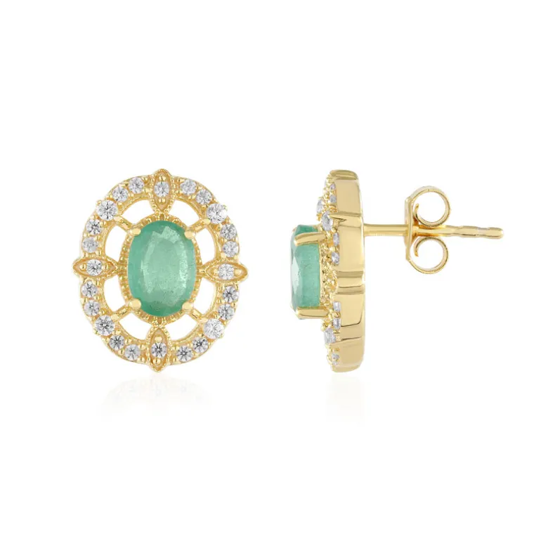 Diese exquisiten Ohrringe bestehen aus leuchtenden russischen Smaragden, die zart in vergoldetes Sterlingsilber eingefasst sind. Funkelnde Zirkone aus Kambodscha unterstreichen ihr elegantes Design. Diese 15 mm großen Ohrringe eignen sich sowohl für den Alltag als auch für besondere Anlässe und verleihen ihnen einen Hauch von Eleganz. Kombinieren Sie sie mit einem eleganten Abendkleid oder einer schicken Bluse, um jedes Ensemble aufzuwerten.