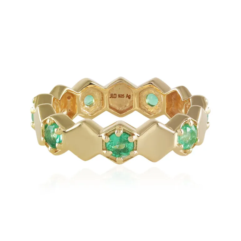 Entdecken Sie die Faszination dieses vergoldeten Silberrings, der eine Reihe russischer Smaragde in einem einzigartigen Wabenmuster zeigt. Jeder Edelstein strahlt in einem üppigen Grünton, der Wachstum und Erneuerung symbolisiert. Dieser Ring eignet sich perfekt, um jedem Ensemble einen Hauch von Raffinesse zu verleihen, und ist vielseitig genug, um von morgens bis abends getragen zu werden. Seine außergewöhnliche Handwerkskunst gewährleistet sowohl Komfort als auch Stil und macht ihn zu einer wertvollen Ergänzung jeder Schmucksammlung.