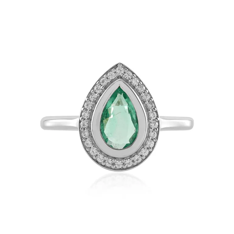 Dieser elegante Ring präsentiert einen fesselnden russischen Smaragd in Tropfenform, der mit seinem Gewicht von 0,686 Karat und seinem markanten Schliff besonders zur Geltung kommt. Er ist in platiniertes 925er Sterlingsilber gefasst, das für zusätzlichen Glanz und Haltbarkeit sorgt, und mit 26 kambodschanischen Zirkonen von insgesamt 0,173 Karat besetzt, die den zentralen Stein mit Brillanz umrahmen. Sein raffiniertes Design und seine Farbe machen ihn zu einem vielseitigen Accessoire, das sich sowohl für den Übergang von Tag zu Abend als auch für besondere Anlässe eignet. Kombinieren Sie ihn mit Pastellfarben oder Erdtönen, um sein üppiges grünes Funkeln zu ergänzen.