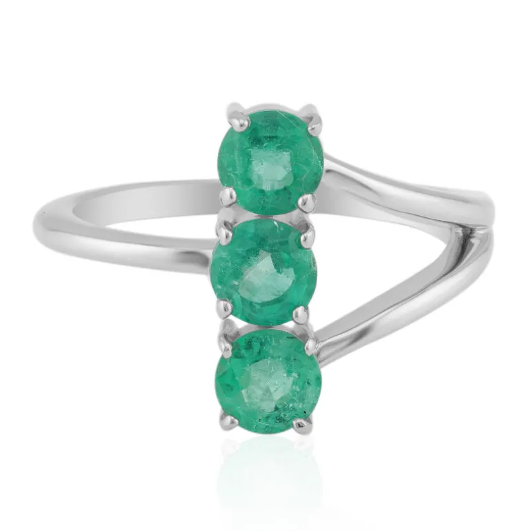 Entdecken Sie die Faszination dieses raffinierten Rings mit drei russischen Smaragden im Rundschliff von insgesamt 1,1 Karat. Eingefasst in glänzendes, platiniertes 925er Sterlingsilber, strahlen die leuchtend grünen Edelsteine Eleganz und Charme aus. Dieser Ring ist die ideale Wahl für formelle Anlässe oder zur Aufwertung von Alltagsoutfits.