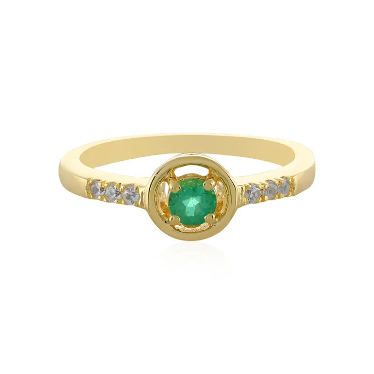 Entdecken Sie die Faszination dieses vergoldeten Rings aus Sterlingsilber mit einem fesselnden russischen Smaragd als Herzstück. Ein rundgeschliffener Smaragd von 0,2 Karat ist majestätisch gefasst und von glitzernden kambodschanischen Zirkon-Edelsteinen von insgesamt 0,131 Karat umgeben. Das Design des Rings präsentiert eine zeitlose Eleganz mit modernem Flair, ideal sowohl für den Alltag als auch für besondere Anlässe. Der leuchtende Grünton erinnert an die Frische des Frühlings und passt gut zu blumigen Kleidern und verleiht neutralen Outfits einen Hauch von Farbe.