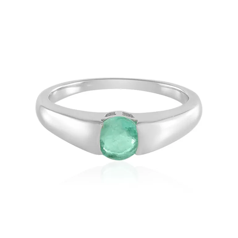 Entdecken Sie den Charme des russischen Erbes mit diesem atemberaubenden Silberring, der einen Smaragd von 0,616 Karat im Rundschliff enthält, der aus den majestätischen Landschaften Russlands stammt. Die Platinbeschichtung des 925er Sterling Silbers verleiht ihm einen luxuriösen Glanz und unterstreicht den grünen Farbton des zentralen Edelsteins. Mit seinem schlanken und modernen Design ist dieser Ring ein elegantes Statement für legere und formelle Anlässe. Ideal für alle, die feine Handwerkskunst und die zeitlose Schönheit von Smaragden zu schätzen wissen.