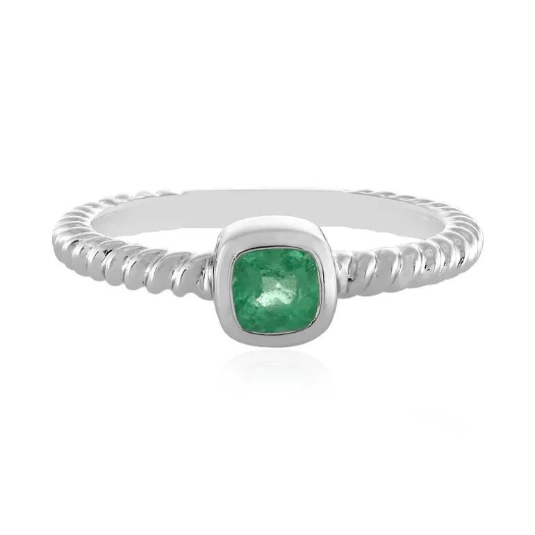 Zeigen Sie zeitlose Eleganz mit diesem Ring aus platiniertem 925er Sterlingsilber, der von einem russischen Smaragd im Kissenschliff von 0,325 Karat geziert wird. Die leuchtenden Grüntöne des Edelsteins sind in einer klassischen Zargenfassung eingefasst und machen ihn zu einem raffinierten Schmuckstück. Das gedrehte Silberband verleiht ihm einen Hauch von Modernität und macht diesen Ring sowohl für den Alltag als auch für besondere Anlässe geeignet. Sein geringes Gewicht sorgt für Komfort, ohne Kompromisse beim Stil einzugehen.
